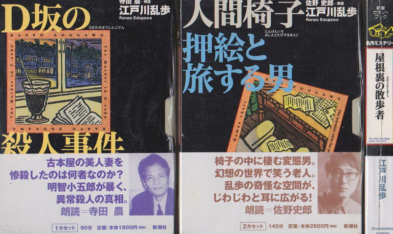 HOME > ミステリー (分類コード:c042) > 「カセットテープ 江戸川乱歩 「D坂の殺人事件」 「人間椅子 押絵と旅する男」 「屋根裏の散歩者」 3巻セット」(江戸川乱歩) 「カセットテープ 江戸川乱歩 「D坂の殺人事件」 「人間椅子 押絵と旅する男」 「屋根裏の散歩者」 3巻セット」購入ページへ シェア ツイート ジャンル:ミステリー 番号:c042-227-1 作者:江戸川乱歩 出版社:新潮社 発行年: 販売価格(税込):1,650円 コメント:朗読:寺田農 佐野史郎 柄本明 未開封 購入ページへ 関連する書籍など 探偵小説全集「 江戸川乱歩集」「 運命の塔外3篇」(江戸川乱歩 コナン・ドイル 延原謙 訳)村山槐多耽美怪奇全集(村山槐多, 江戸川乱歩, 津原泰水 著)少年探偵29 魔術師(江戸川乱歩)人間椅子(江戸川乱歩 著 ; ヤン・シュヴァンクマイエル 画)シャーロック・ホームズの冒険(コナン・ドイル著 ; 江戸川乱歩訳)江戸川乱歩コレクション(Ⅰ~Ⅵ)6冊セット(江戸川乱歩 著 ; 新保博久, 山前譲 編)少年探偵34 緑衣の鬼(江戸川乱歩)少年探偵36 人間豹(江戸川乱歩)怪談入門(江戸川乱歩 著 ; 東雅夫 編)
